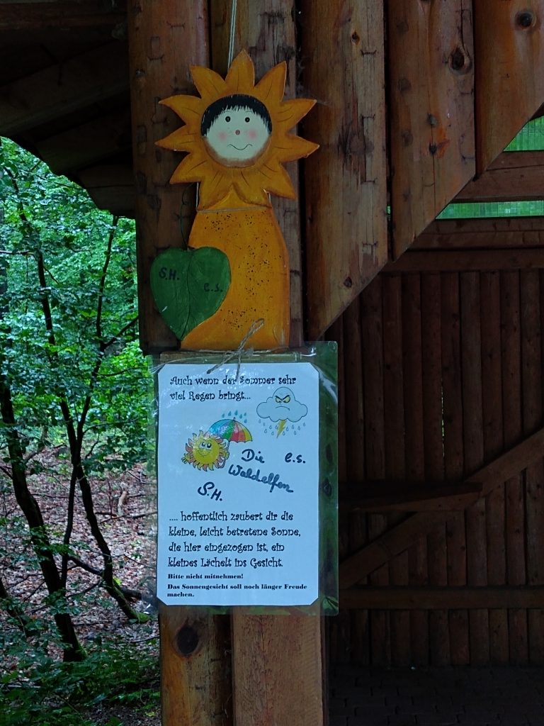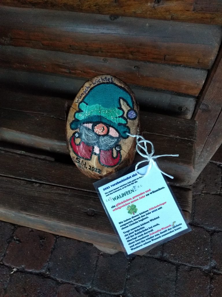 Der niedliche Glücksbringer hat leider einem Wanderer zu gut gefallen. Nach nur wenigen Tagen war er aus dem Wald verschwunden und konnte trauriger Weise keine Wünsche mehr erfüllen. Wahrscheinlich ist er in einem Privathaushalt gelandet, was uns ganz schön genervt hat.